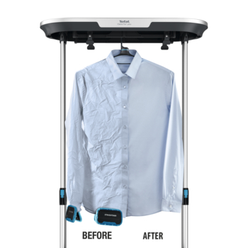 Discover the hands-off garment care solution that does the work for you: The Tefal Care For You Automatic Steamer Purifier dewrinkles, sanitizes and removes odors from clothing and all home textiles—all with an automatic process that couldn't be easier. Revolutionize your morning routine: Simply insert up to 3 items of clothing for efficient wrinkle removal in just 10 minutes, or leave garments in for up to 30 minutes for stubborn wrinkles. The effortless 40-minute sanitizing cycle removes odors like smoke or fried food, while raw steam power kills up to 99.99% of viruses, bacteria and germs*.